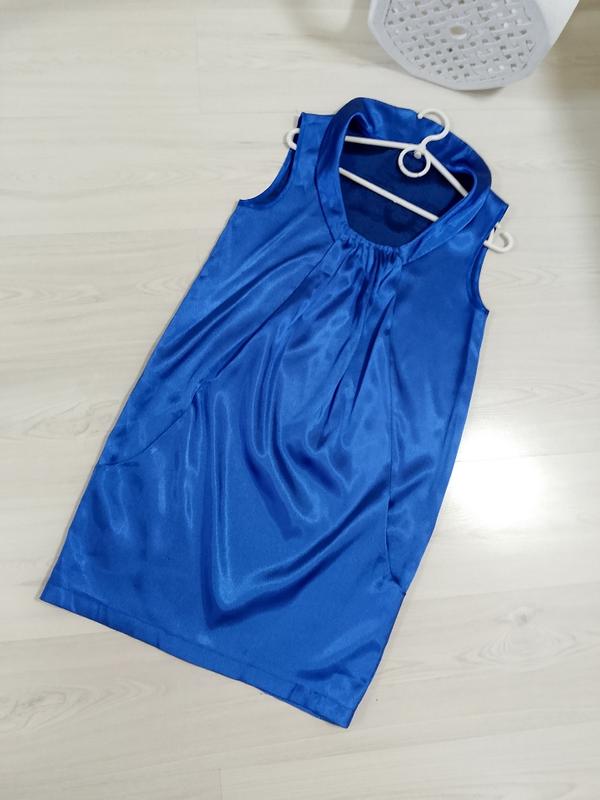 Платье атласное / спереди два кармана / без рукавов / классическая / чадная однотонная / летняя / женская. Цвет - синий. Оттенок зависит от освещения. Размер не указан. Бирок и этикеток не имеет. Может быть s,m. Линия под подмышками 45 см. Линия груди 46 см, тянется чуточку больше. Линия бедер 50 см, тянется больше. Ширина внизу 46 см. Длина от плеча 85 см. Плечи 38 см. Ткань плотный стретч атлас. Спереди внизу имеет зацепка (последняя фото).
