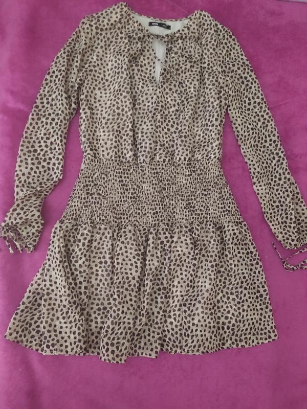 Игровое платье, с прикольным принтом, талия выделяется за счет интересного пошива, на рукавах внизу завязки есть, ткань из легкая, все интересные элементы на фото присутствуют.