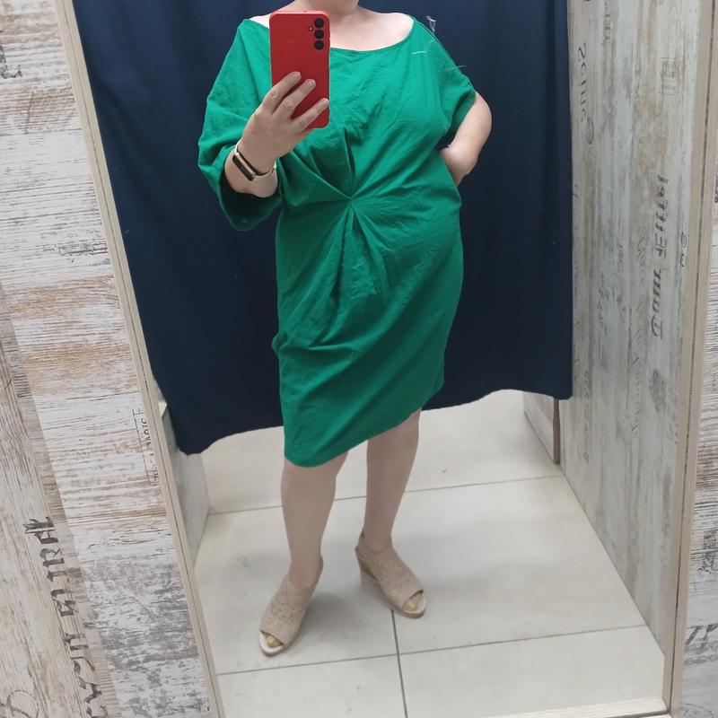 Новое платье красивого насыщенного зеленого цвета. 100% котон. Интересный фасон с ассиметрией. Сбоку застегивается на потайную молнию. Указан размер L. Одето на рост 155 см, укр 48/50