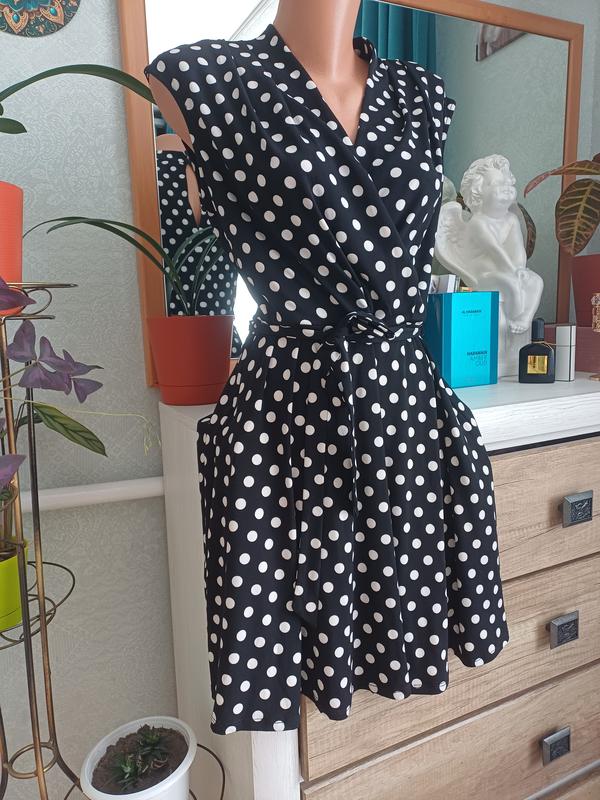 Плаття в горох. Коротке, талія регулюється поясом. Довжина- 86 плечі- 45 Довжина до талії- 43 см півобхват талії- 42 см Не потребує прасування. Матеріал тягнеться. Недоліків немає, річ вживана.