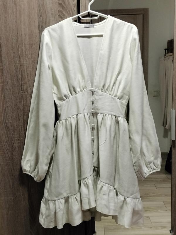 Платье с V-образным декольте и перламутровыми пуговицами цвета льна При покупке от 2-х товаров со страницы - скидка 10% В ассортименте, в частности, вещи таких брендов, как Rikky Hype, Zara, H&M, Reserved. Также есть украшения и женские сумки, немного обуви и верхней одежды.