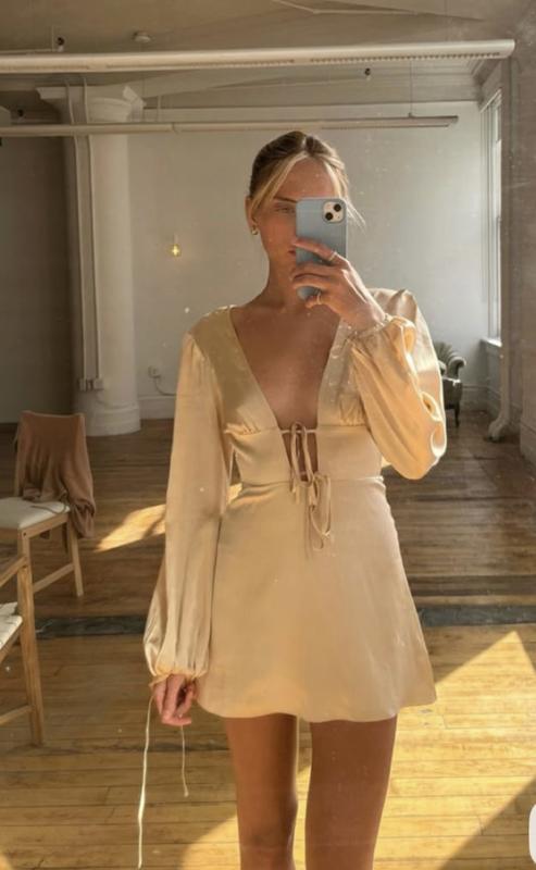 Oh Polly | Розмір UK 6 (XS) 🤍 Ніжна, легка та з акцентом на деталі — ця сукня ідеально балансує між жіночністю та комфортом. 👗 Фасон — трішки вільніший, не обтягує, красиво спадає по фігурі ✨ Глибоке декольте зі зав’язками на грудях — виглядає ніжно, але при цьому дуже ефектно 🎀 Довгий рукав — легкий, повітряний, додає елегантності 🔒 Боковий замочок — зручно одягати та знімати, добре фіксує силует 🌸 Колір — ніжний беж — універсальний, підходить і для денного, і для вечірнього образу. 📏 Розмір UK 6 (XS): ▫️ Груди: 82–86 см ▫️ Талія: 60–64 см ▫️ Стегна: 88–92 см 💡 Підходить для: – романтичного побачення – святкових подій – фото-/відеозйомки – вечері або прогулянки з акцентом на стиль