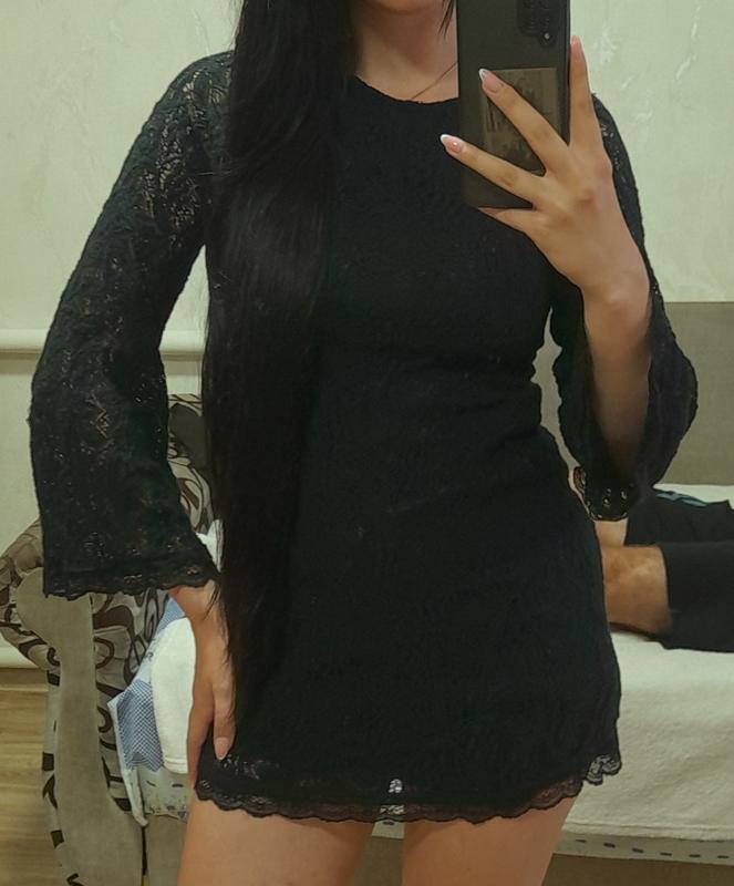 Тип: платье мини/короткое платье. Цвет: Черный. Материал: Возможно, кружево или ткань с кружевной фактурой, особенно на рукавах. Рукава: Длинные, расклешенные книзу, выполненные из кружева или прозрачной ткани с кружевным узором. Детали: Кружевная отделка по краю подола и манжетов рукавов. Фасон: Приталенный силуэт, подчеркивающий фигуру. Вырез: Круглый