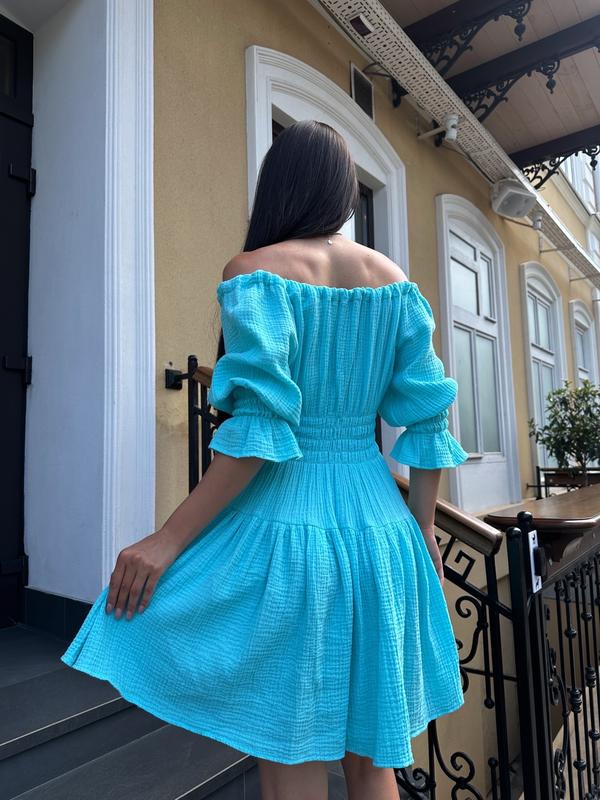 Легка і невагома літня сукня з мусліну. Завдяки великій кількості маленьких резиночок,гарно сідає та майже не відчувається на тілі. Однотонні,як на фото У наявності Розміри : S/M Довжина по спинке -79 По рукаву -47 На обʼєм по груді до 110 см