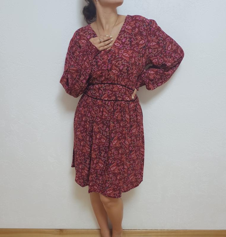 Яркая вискозная миди-платье от качественного британского бренда Fat Face. Изготовлена она из высококачественной 100% вискозы: плотная, плотная, при этом легкая, мягкая, нежная и приятная к телу, не просвечивает. Платье имеет комфортный крой: имитация корсетной талии, красивый V-образный вырез, пышные рукавчики с тонкими манжетами, расширенная к низу юбочка. Для данной вещи подобрали обильный принт пейсли в красивом сочетании вишневых и брутных оттенков. Легкая, комфортная вещь, которая пригодится в любой сезон. Для примера прикрепляю официальный сайт бренда (образное платье будет варить на нем около 4000-5000 грн) - ************************************************************************************************************************************************************************************************************************************************************************************** Размер: на наборе указан 44 размер, соответствующий XL-XXL, и лучше ориентироваться на замеры. Замеры: ПОГ - 48 см, ПОТ - 41 см, ПОБ - 68 см, низ - 88 см, длина - 97 см, плечи - 42 см, длина рукава - 66 см, ширина рукава - 42 см. Состав: 100% вискоза. Параметры модели на фото: ОГ - 84 см, ОТ - 68 см, ОБ - 96 см. Рост - 170 см.