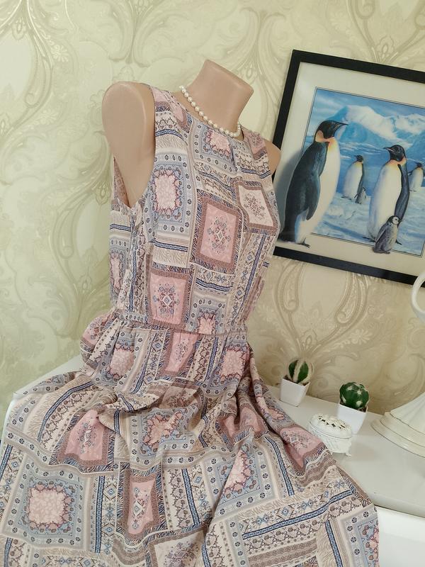 Платье короткое без рукавов-печворк мозаика орнамент легкий летний/ талия на резинке женская/ Janina. 100% Viscose. Цвет бежевый, коричневый, светлый розовый, голубой, синий. Размер указан EUR 40/It 44/FR42. Может быть L. Линия под подмышками 48-50 см Линия груди 48-50 см. Линия талии 40-55 см, на резинке. Линия бедер 70 см. Плечи 32 см. Длина от плеча 96-97 см. Ткань легкая, слегка просвечивает.
