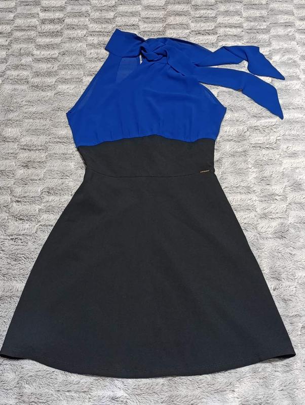 Заміри на фото. есть микроняанс (последнее фото) Завязывается на шее, на 2 пуговицы сзади, вырез на спине; на молнии сзади. Спереди двойная ткань, поэтому не просвечивает.