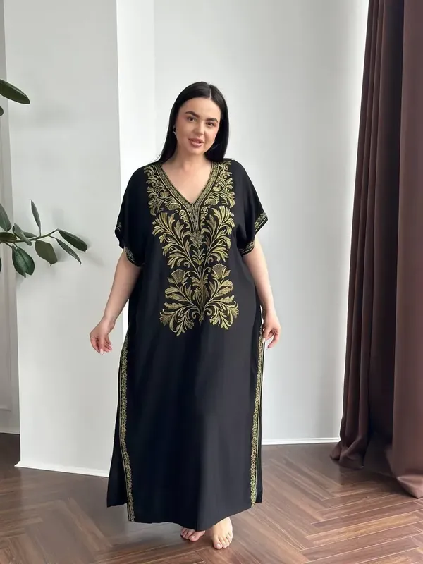 Роскошное платье-туника с золотым узором в восточном стиле создано для королев PLUS SIZE! SW3533 Она: Не обтягивает - комфорт гарантированно Элегантный крой, визуально вытягивающий силуэт Стильная вышивка, которая сразу привлекает внимание Идеально для дома, праздников, вечеринок, поездок, встреч Идеально в жару - ткань натуральная, 100% вискоза Размер универсальный: грудь/бедра 110-150 см Цвет: классический черный с золотым декором Быстрая доставка по Украине и за границу Наше платье создано, чтобы ты чувствовала себя свободно, красиво и уверенно