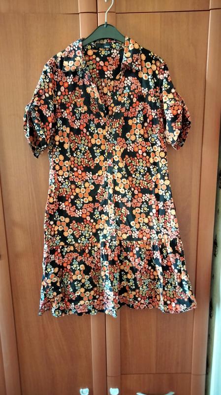 Легкое хлопковое платье от Next. Отложной воротник, короткий рукав, спереди на пуговицах (не до конца). Яскравий принт. Размер M-L. Ориентируйтесь по замерам Н/о груди -47см Н/о бедра- 51см Длина - 93см Возможна погрешность+1см