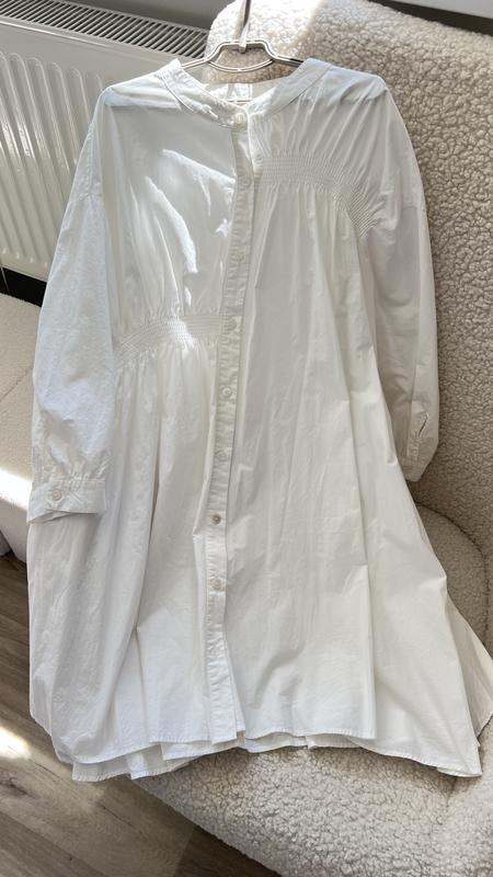 Біла сукня від Zara вільного крою — дуже зручна та стильна. Хоча розмір вказаний як L, я носила її на розмір S — виглядала вільно та красиво. Виготовлена з якісної тканини, яка добре “дихає”, тому навіть у спекотну погоду в ній комфортно.