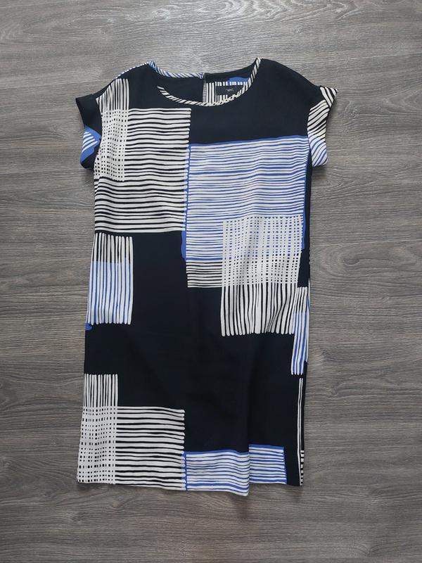 Великолепное платье прямого силуэта с коротким приспущенным рукавом. Круглая горловина, на подкладке, актуальный фасон, звенящий геометрический принт. Хорошо держит форму и скрывает недостатки фигуры. размер М, подойдет и на С, если любите, чтобы сидело более свободно. лучше ориентироваться по замерам: длина 86 см, полуобъем под грудью 49 см, бедра 50 см. Без дефектов.