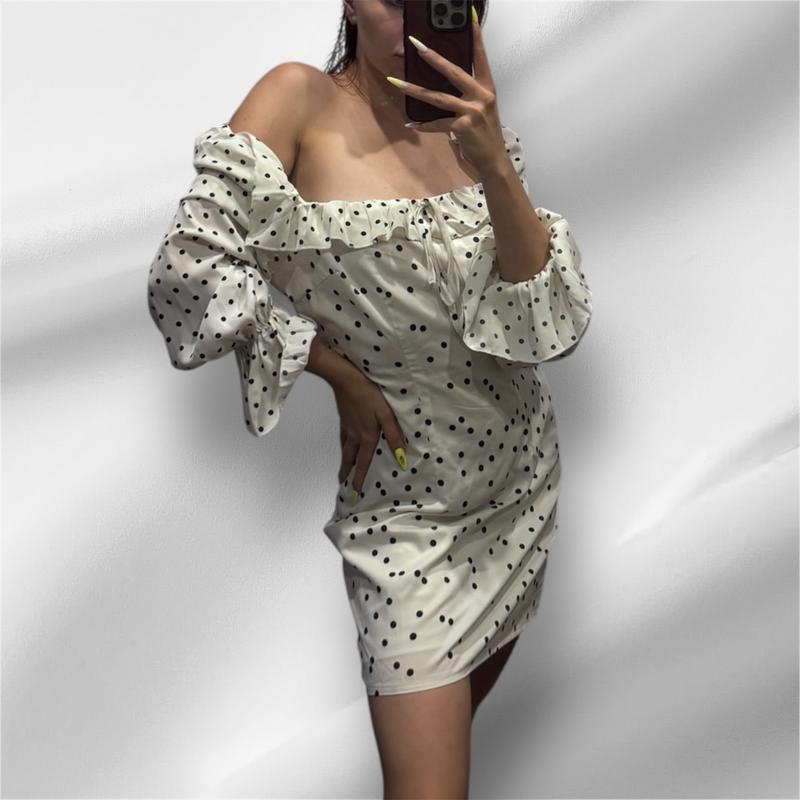 Сукня, яка закохує з першого погляду Ніжна, жіночна, з трендовим принтом у горох - ця сукня створена для романтичних вечорів, прогулянок містом або фотосесій, де хочеться виглядати вау Мʼяка тканина, приємна до тіла Обʼємні рукави з манжетом Актуальний фасон з рюшами на декольте Ідеальна посадка по фігурі