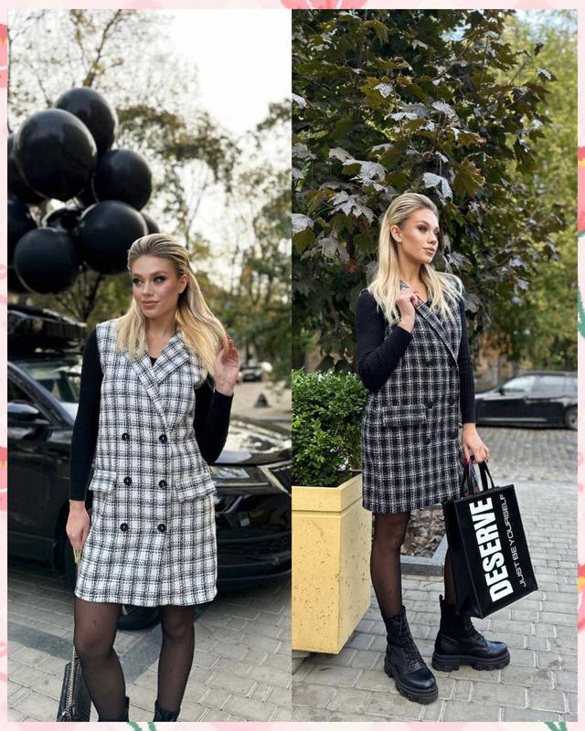 Сукня - жилетка Мод RC- 62 Размеры: 42-44, 46-48 Цвет: черный и молочный Ткань : твид Стильна сукня жилетка, которую можно комбинировать с любым свитером, гольфиком или рубашкой. Соединив ее с каблуком - образ будет женственным и утонченным, а если надеть платье под массивные ботинки, то образ будет более драйвовым и молодежным.
