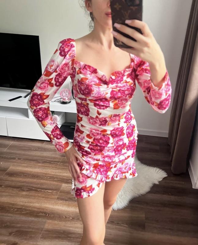 Вишукана яскрава сукня в квітковий принт. Розмір С, стан нової. Пог 42, пояс 33, рукав 62, довжина 82, бедра 44. Тягнеться. Дивіться інші оголошення, речі від 20 грн