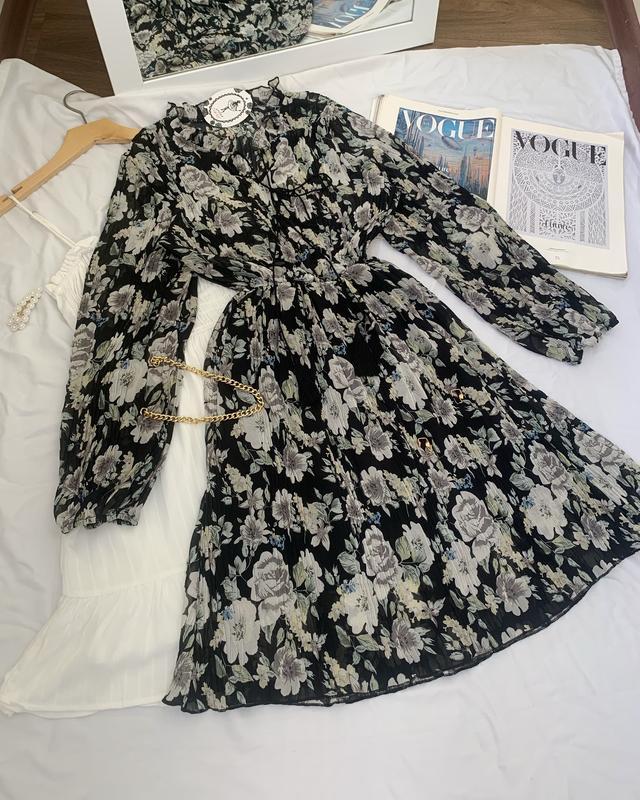 Нова сукня у квіти Розмір L Довжина 98 см Півобхват грудей 45 см, тягнеться Півобхват талії тягеться до 45 см, резинка Рукав 61 см У зоні спідниці підкладка, не просвічується У зоні грулей підкладки немає, за рахунок принту трохи світить Матеріал: поліестер Бренд інший!!!