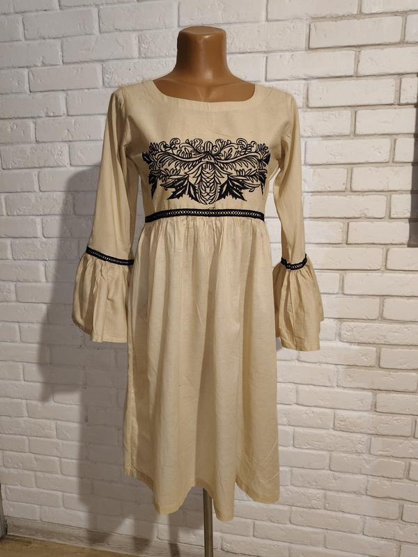 Платье бежевого цвета вышито черными нитками в этническом стиле длинный рукав в идеальном состоянии, размер указан S. Замеры НПО груди 48 см., НПО талии 40 см., НПО бедер до 50 см., длина рукава 53 см., длина платья 93 см.