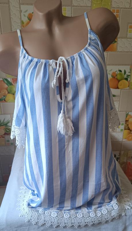 Нежное женское платье с кружевом. Цвет: голубой + белый (полоса) Особенность фасона: открытые плечи, освободного кроя. Сезон: лето. Материал : 100% хлопок. Производство: Италия Pammy Pronto Moda. Размер : GB8/S Украинский 42-44. Замеры : длина изделия - 86см; полуобъем груди - 50см; полуобъем талии - 52см; полуобм бедер -59см;длина рукава - 31см,напеобхват рукава - 17см.