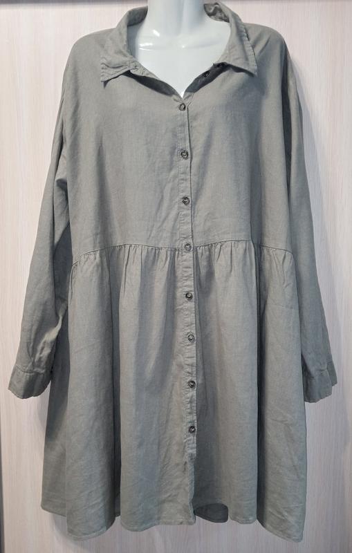 плаття вільного крою, 55% льон, 45% картон. Напівохват грудей 66см, плечі 48см, довжина рукава 57см, рукав підбирається та фіксується гудзиком, довжина 93см