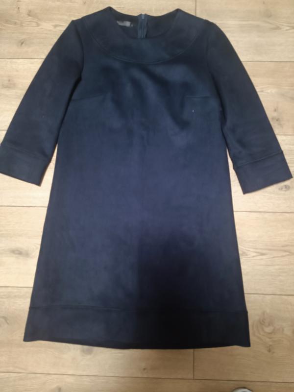 Платье из замши на дайвинге темно синего цвета с интересной горловиной, рукав три четверти. Сзади имеет молнию. Длина 85 пог 43 длина рукава 44