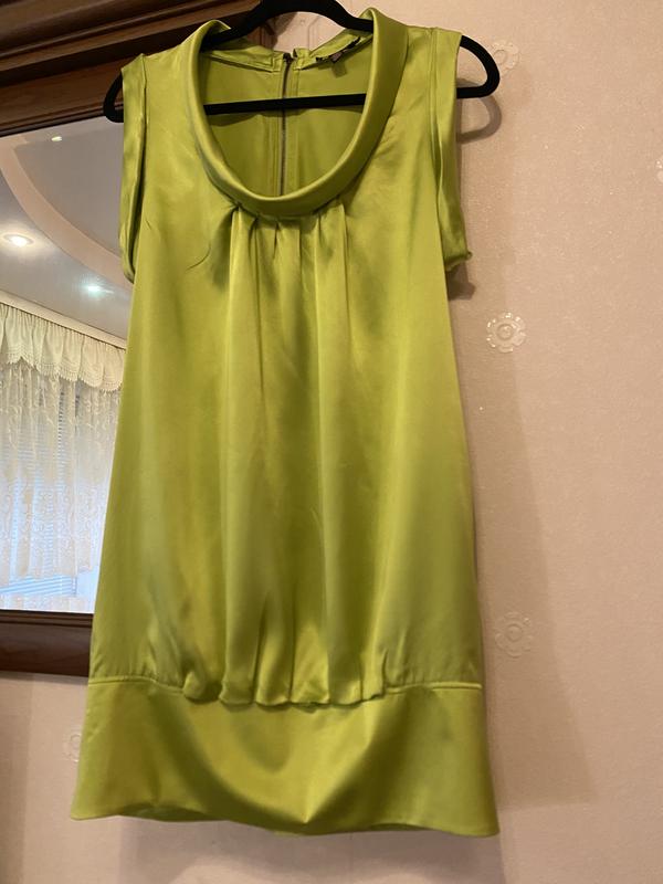 Сукня туніка кольору лайм, або салатовий. Перші фото трохи викоивляють колір, він не гірчичний, а саме салатовий. Виготовлено із натурального шовку. Без рукавів, фасон вільний, внизу широка планка. Спереду до планки драпіровка. Позаду довга метелева молнія, яка служить також і елементом дизайну, вони пришита згори.комір круглий хомут, позаду застібається на ґудзик з навісною петелькою. Окат рукава також прикрашений підворотами, як на комірі. Відмічу, що пройма рукава досить викочена. Дивіться заміри і замовляйте безпечну оплату, щоб приміряти. Розмір яказано 3, що відповідає європейському 38-40. Заміри: НОГрудей 50 см ( на грудях від горловини закладені складки, типу драпіровка ) Талія 55 см Планка по низу 48 см Довжина по спинці 81 см Плече 9 см Напів Окат рукава 27 см