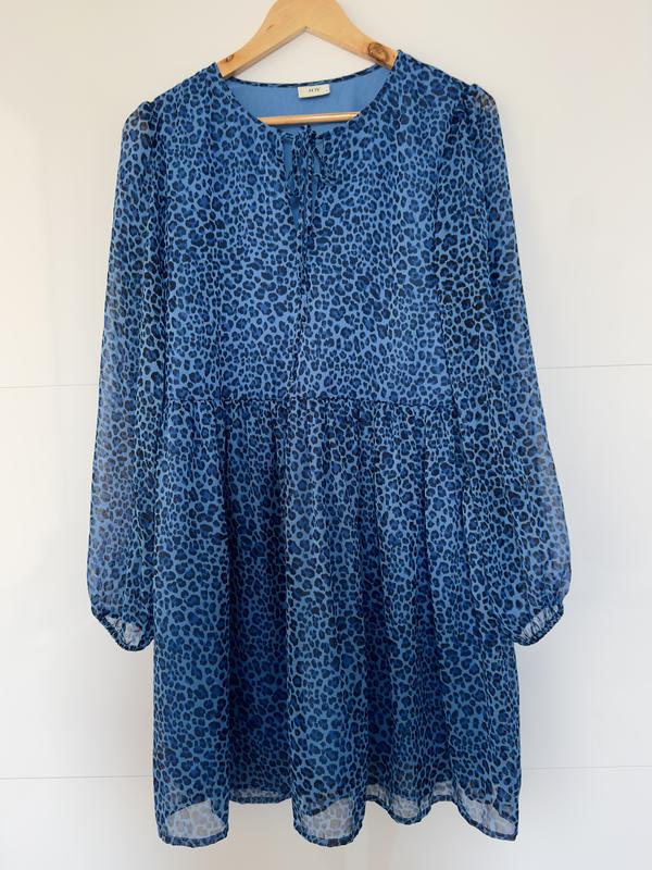 Сукня від бренду jacqueline de yong, леопардова, гарного глибокого синього кольору, під шифон, з підкладкою внизу, розмір М, але нормально буде і на Л, в талії досить вільно сидить. Пог - 50 см Довжина - 85 см Всередині є маленькa зацепочкa, але ззовні не видно(останнє фото)