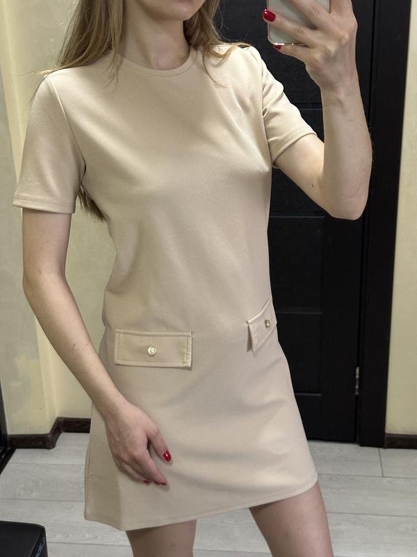 Стильна сукня підійде до офісного або навчального закладу. Не буде дуже короткою для високих дівчат. Колір беж-рожевий, без застібок та ґудзиків, добре тягнеться та комфортно сидить