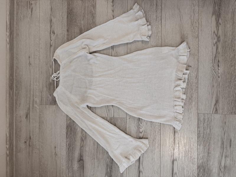 Молочна в’язана сукня з воланами та розкльошеними рукавами
