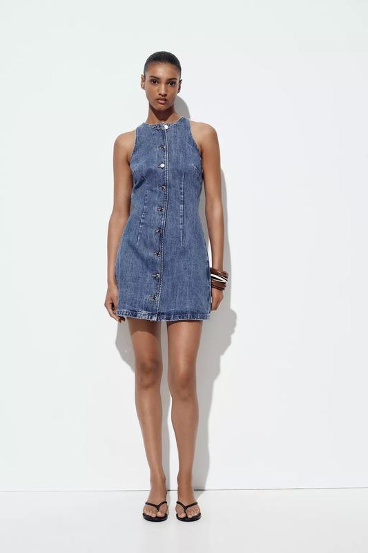 Сукня з круглим вирізом горловини та без рукавів. Застібається спереду на металеві ґудзики. СИНІЙ | 6147/092/427