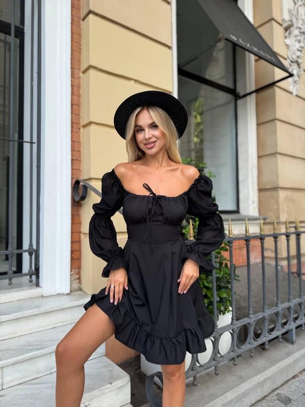 Сукня 2970 Розміри 42-46,48-52 Довжина міні 87см По талії ширина регулюється. Спідниця розклешена 140см Розмір 42-46 обхват грудей 90-96см, розмір 48-52 обхват грудей 96-108см. Тканина шифон, софт. У білому кольорі по спині підкладка. У чорному, білому кольорі.