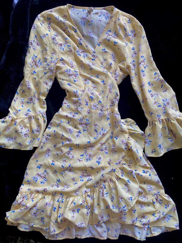 Сукня жовтого кольору в квітковому принті на запах, з V-образним вирізом та рукавами 3/4