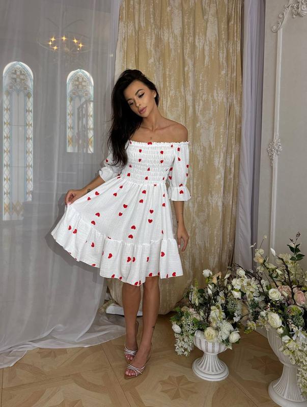 Размер и Цена ⤵️ Норма (42–44, 46–48) - 1100 грн Балал (50–52) - 1130 грн Ткань: муслин Размеры: 42–44, 46-48, 50-52 Цвет: белый Сезон: весна/лето На фото платье пошита из хлопковой ткани с эластаном, идеально подходящей для летней одежды. Описание: Нежное летнее платье с открытыми плечами, украшенное сердечками. Верх выполнен со сборкой-смокинг, отлично прилегает к фигуре, создавая комфорт и женственный силуэт. Объемные рукава 3⁄4 с рюшей добавляют образу романтичности. Юбка с легкой оборкой по низу создает нежный объем и мягко колеблется при движении. ❤️Мод 201