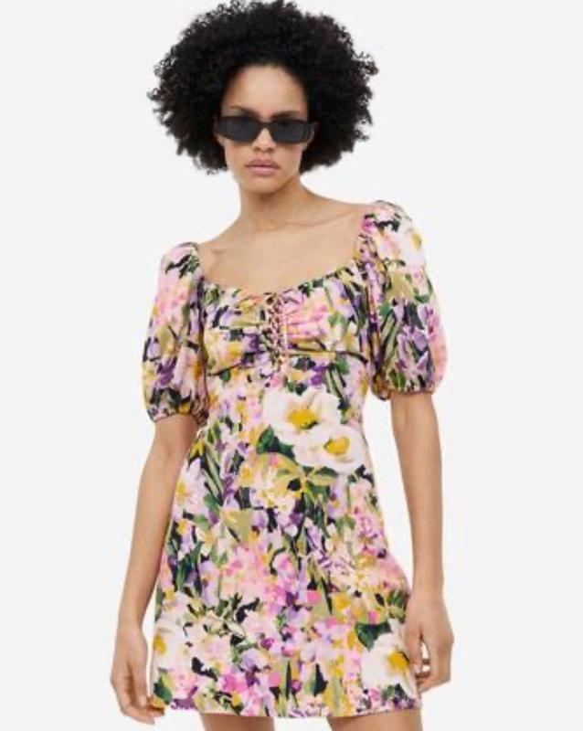 Гарна сукня міні Котон принт квіти с8 Довжина з плечами 83 Напівобхват грудей 37 плюс шнуровка Талії 33-35 сзаду широка гумка Стегон 42