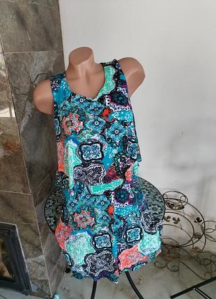 Кламна літня сукня, туанина трикотаж, тягнеться Гарно сідає по фігурі, цікавий крій Довжина 88 см Ширина під проймою 50 см Ширина в стегнах 56, в талії 50 Крій суцільний, але верх пришит окремоі в таліі не фіксується
