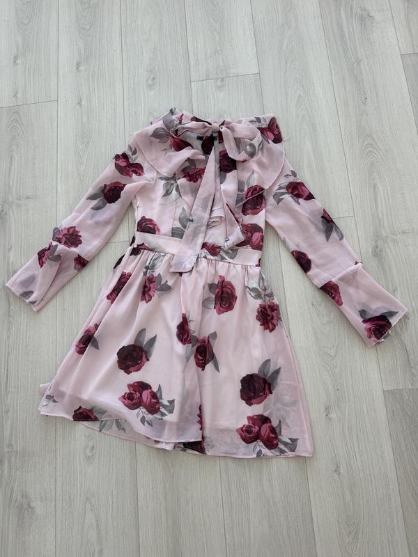 Міні сукня з рукавами кльош, і бантиком на шиї. Дуже мила, з підкладкою. Трояндовий принт, збоку на застібці. Рукав - 56см Довжина - 76см Талія - 35см Плечі - 36см Груди - 40см Внизу більш вільна, дуже легенька, літня