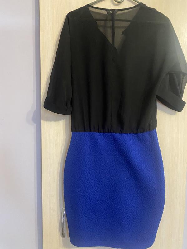 ПО груди - 46-47, Длина от плеча - 96, ПО талии 36 в спокойном состоянии, тянется до 42, ПО бедер 45, тянется до 50. Рукав короткий. Низ ткань синяя в розы выпукле. Платье приятное к телу, в красивом состоянии. Верх немного прозрачный, не сильно. Защипывается сзади на пуговицу