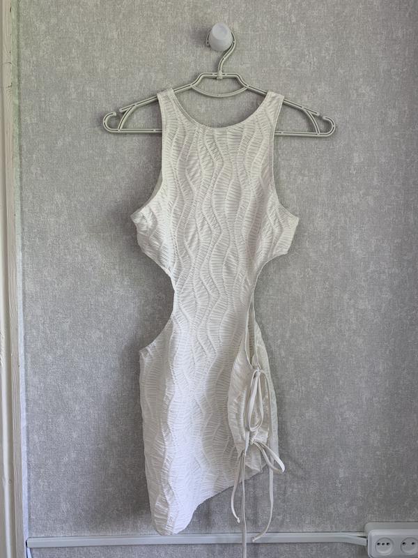 Біла сукня (не білосніжна, ближче до молока) з вирізами на талії і по бокам і асиметричним вирізом на бедрі, який регулюється зав’язками. Вказаний розмір S. Можливо і М влізе за рахунок зав’язок на бедрі, але тоді орієнтуйтесь по грудям, бо тканина тягнеться небагато. Я бачу цю річ на купальник. Як для сукні для мене надто відверто Тканина нагадує вафельну