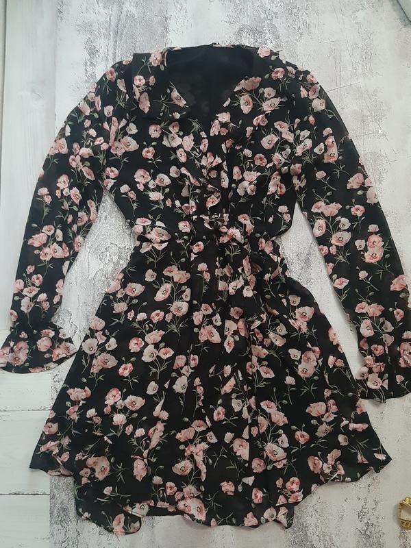 Платье в цветочный принт, снизу подклад, пояс на резиночке, состояние новой, одевала пару раз, идет на размер ХС-С, будет отлично смотреться как под кольца так и под кроссовки, сзади немножко удлинина замеры высота спереди 86 см, сзади 88 см Рукав от плеча 60 Рукав от шеи 69 в груди 46 пояс 29 тянется до 42 в бедрах свободно +-52 см