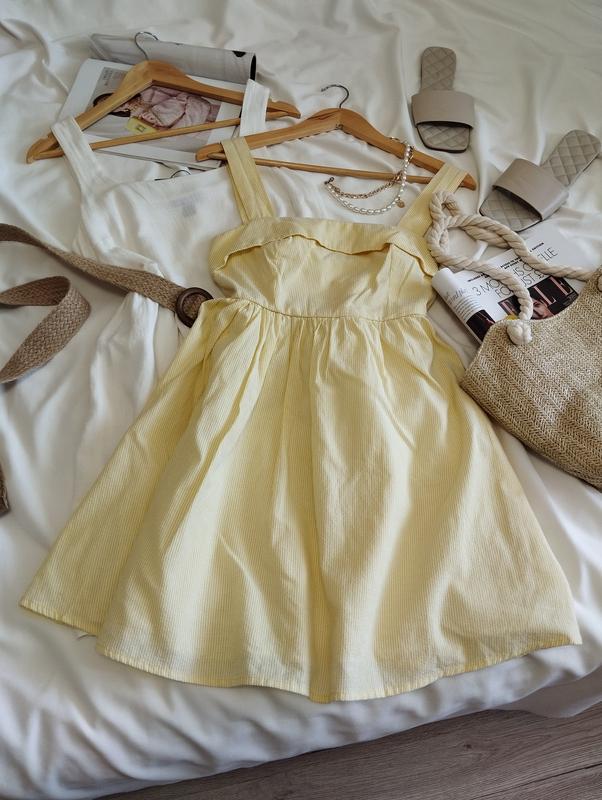 Платье-мини FB Sister. Размер S. Желтая, в вертикальную полоску. Открытая спина, завязывается на бант. Материал: 50% коттон, 50% полиэстер. С подкладкой В идеальном состоянии Длина 83 ПОг 44 + вытачки + регулируется завязками ПОт 33 - 48 После свободно