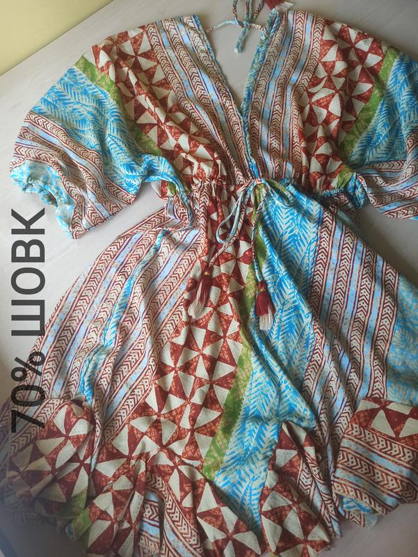 Летнее платье, пояс на резинке с завязками кисточками. V вырез из переда и на спине. Подойдет на размер XS,S,M. Ткань плотная не просвечивает. Почти не мнется, с легким блеском.
