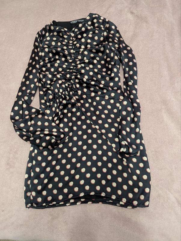платье мини, сатиновое в гороховый принт, идеальное состояние дефектов отсутствует.Размер по сборке m(но лучше на s) замеры Рукав62 Талия 74 Груди 74 Бедра100 Длина 83