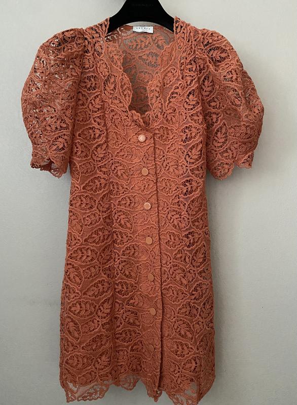 Мереживна сукня на гудзиках від Sandro 🧡 Обʼємна фактурна тканина, добре тримає форму Гудзики робочі, в тон сукні, брендовані Сукня на підкладці від грудей Фігурне декольте, рукава ліхтарики Красивий мереживний візерунок на рослинну тематику Колір терракот Розмір ХС , 36 Дрвжина 87 ПоГ 44 ПоТ 40 ПоБ 47