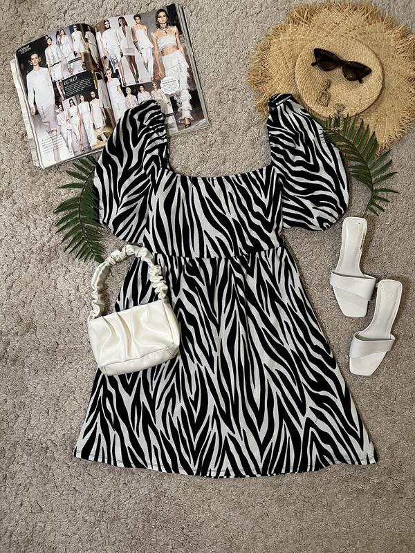 Для более точного определения, замеры, сравнивайте с измерениями подобной вещи, а не со своими объемами. Свободное мини платье в принт зебра. Ткань тонкая, фактурная, не просвечивается, немного тянется. Без застежки, без подкладки. Лиф свободно прилегает. Талия отрезная, на резинке. Юбка трапеция. Рукав объемный. Плечи и манжеты на резинке. Состояние: очень хорошее. Эффекты: нет. Размер на бирке: 18/20 рдинаторы изделия измеряются в полуобхвате, а не от шва до шва!ook Замеры изделия: Плечи 30 см., Рукав 40 см., Высота проймы 36 см., Ширина рукава 28-15 см., Полуобхват груди 57-69 см, Полуобхват талии 55-66см., Полуобхват бедер 82 см., Полуобхват низ 102 см, длина по спине 76 см, длина от плеча 95 см., длина от плеча до талии 39 см.. Состав ткани: 98% полиэстер, 2% эластин. Страна производитель: Бангладеш. Бренд: Primark. Оплата и доставка: Оплата на картку монобанк. Брожение на оплату только 24 г. При изменениях цель покупать обязательно сообщайте! Доставка: На время введения военного состояния, уточняйте, возможна ли доставка до Вашего пункта. Актуальные новости можно уточнить на сайте перевозчика и по телефону контакт-центров. Не забудьте ПОДПИСАСТЬ, чтобы быть в курсе всех новинок и распродажей!