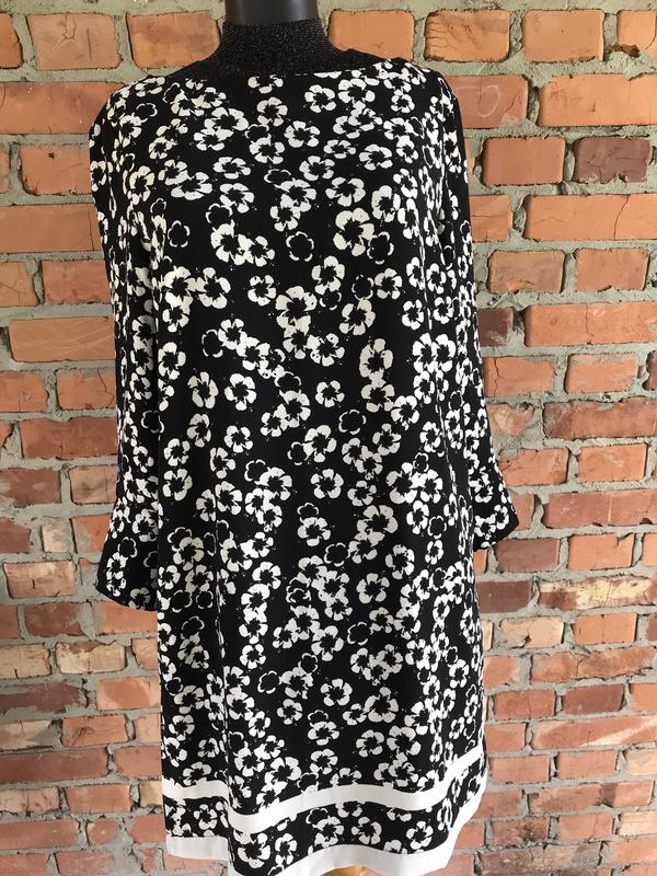платье длиной до колена с вырезом лодочкой и рукавами длиной три четверти с разрезами и пуговицей снизу.