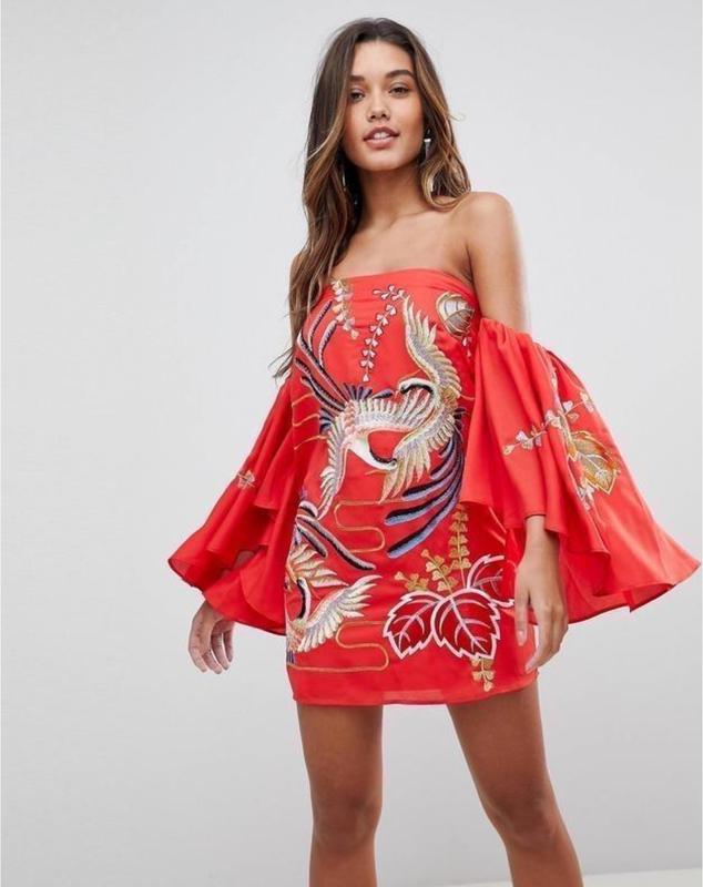 Яскрава та ефектна сукня-міні з відкритими плечима та розкльошеними рукавами, прикрашена розкішною вишивкою у східному стилі з птахами та рослинними мотивами. Легкий струмливий крій створює виразний та святковий образ. Ідеальний вибір для вечірок, фотосесій, особливих подій. 📌 Усі речі нові. Бірки зрізані сайтом — це оригінальний outlet ASOS. ASOS сам зрізає бірки на речах зі стоку, щоб їх не повертали на сайт за повною ціною — це офіційна політика бренду. ❗️Товар не був у використанні і не має запаху секонд-хенду. Uk 8 Floral mini