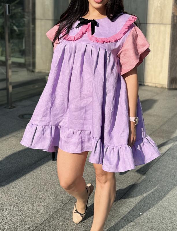 Яскравий серпень Сукня з 100% льону ідеальний вибір: ніжний лавандовий колір з рожевими акцентами; грайливий комір з воланами та бантом; натуральна дихаюча тканина; вільний крій пасує будь-якій фігурі. 2500 грн