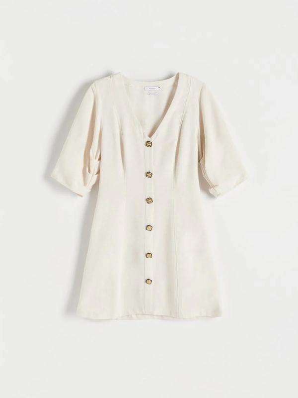 Стильна сукня віскоза/льон в світло бежевому кольорі з акцентними красивими гудзиками. Розмір пише Л , але по факту буде М , невелика л . Вона повинна вільно виглядати ( не обтягувати ) . За потреби зроблю заміри.