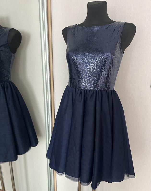 Элегантное вечернее платье насыщенного темно-синего цвета. Верх выполнен из блестящих пайеток. Объемная юбка из 5 слоев. Сзади вырез, застежка снизу на замок и сверху на 3 крючка. Полу обхват талии 35 см, длина от талии 47 см