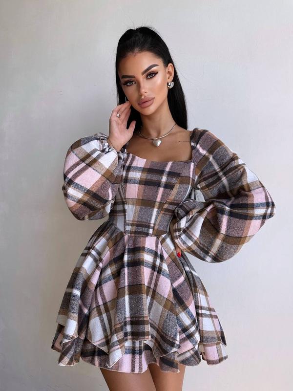 ‼️Платье под пошив, ожидать 3-7 рабочих дней!️ *Актуальные сроки отправки уточняйте у менеджера в чате перед заказом Корсетное платье с двойной юбкой и объемными рукавами в клетку 5 цветов ▫️ткань: байка клетка ▫️размеры: S, М (L +250 грн)