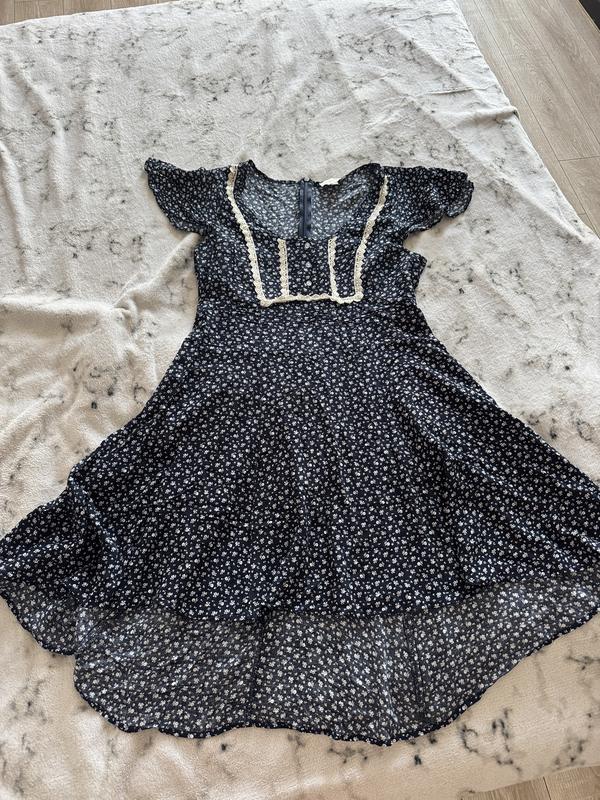 Сукня легка, майже не відчувається на тілі. З принтом в квіточку Спереду трохи коротка ніж ззаду. Застібка ззаду. Стан ідеальний😍 Розмір підходить на S-M