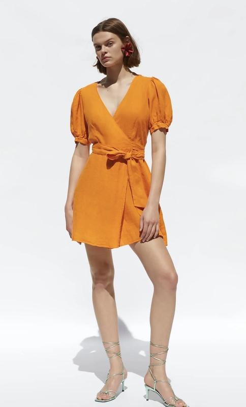 Яскраве помаранчеве плаття з льону 100% Zara В новому стані На розмір XS-S 100% льон (Довжина 90 см ,Пог 47 см, Рукав 30 см Пот 36 см( регулюється за рахунок поясу)